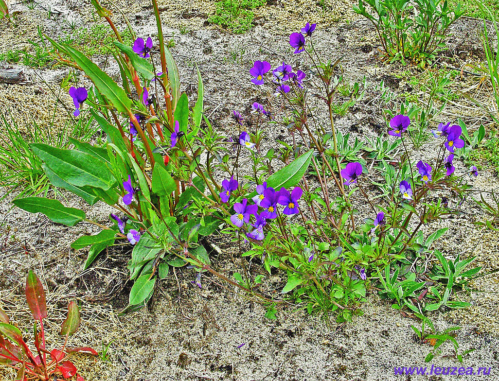 Анютины глазки (Viola tricolor - фиалка 3-х цветная), на фоне щавеля лесного (слева).