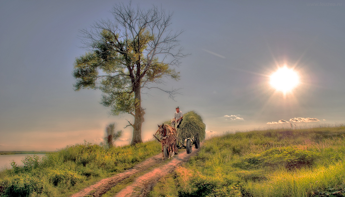 Лошадь с повозкой сена