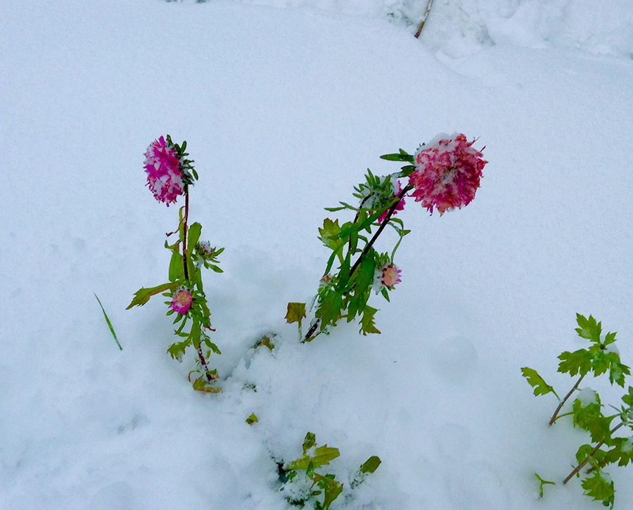 Астры заснеженные - всю ночь сегодня шел снег и засыпало цветы слоем снега 20 см